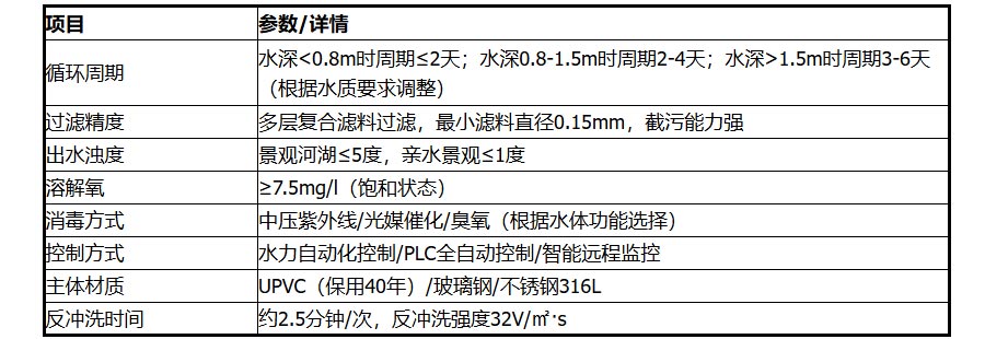 景观水体(人工湖/河)→ 循环泵 → 曝气融氧箱(去除有害气体、增加溶解氧)→ 生物接触氧化池(微生物降解有机物)→ 精密过滤器(多层复合滤料过滤悬浮物、藻类)→ 消毒除藻装置(紫外线/臭氧/光媒催化)→ 回水至景观水体