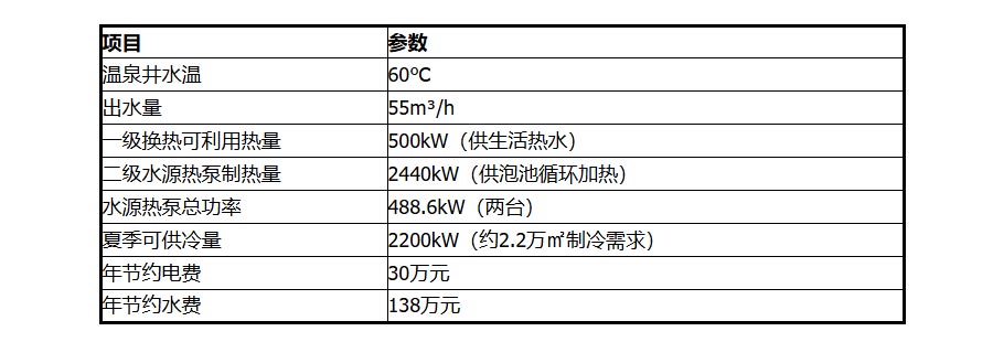 山西忻州某温泉康养项目:温泉井水温60℃,出水量55m³/h,富含20多种矿物质微量元素。采用地热梯级利用+水源热泵系统,一级换热提供生活热水500kW,二级水源热泵制热2440kW供泡池循环加热。系统全年节约电费30万元、水费138万元,实现“取热不取水”的节能环保目标